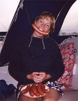 AmyAfter the flurry of activity over the last month or so, we are really appreciating these lounging sorts of days. The visiting troops headed into town once again to hang out while the ship's crew handled those things that the ship's crew handles (filling water tanks, looking in horror at the head, etc.) We all gathered in town for lunch, which was wonderful. It was one of those days when you secure a table outside and are glad when your waiter disappears (after filling your drink order) for extended periods. The sky was blue, the atmosphere festive, the people-watching funky. We separated afterwards to run an array of errands. Roger and Bill returned to the boat a bit tipsy and tattooed (happily only the temporary version). They had encountered an interesting bartender who had spent several years teaching scuba diving on Cat Island in the Bahamas. He had all sorts of good advice about southern sailing and how to drink vodka in the heat. For dinner we had some fairly impressive hot dogs cooked on the new (and viciously hot) grill. Once again, no one was injured.